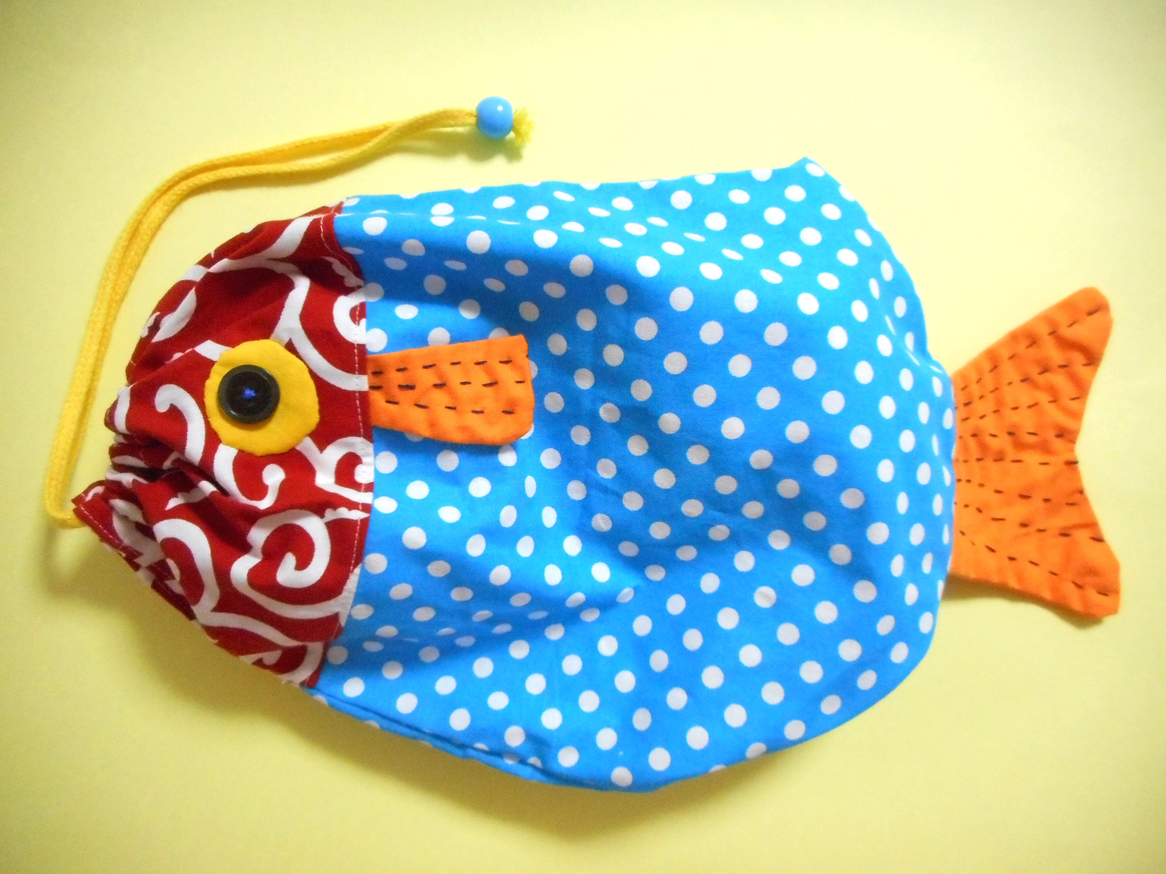 娘のために作った、魚の形の巾着袋。